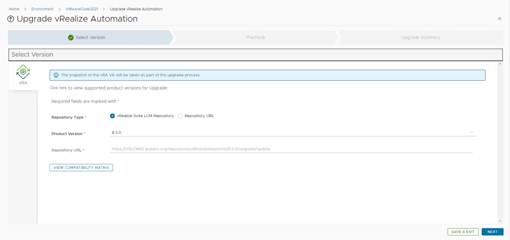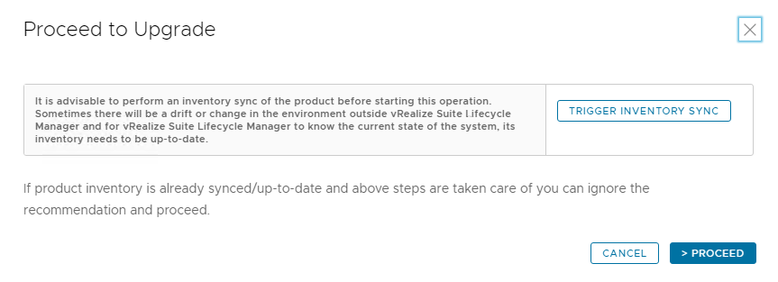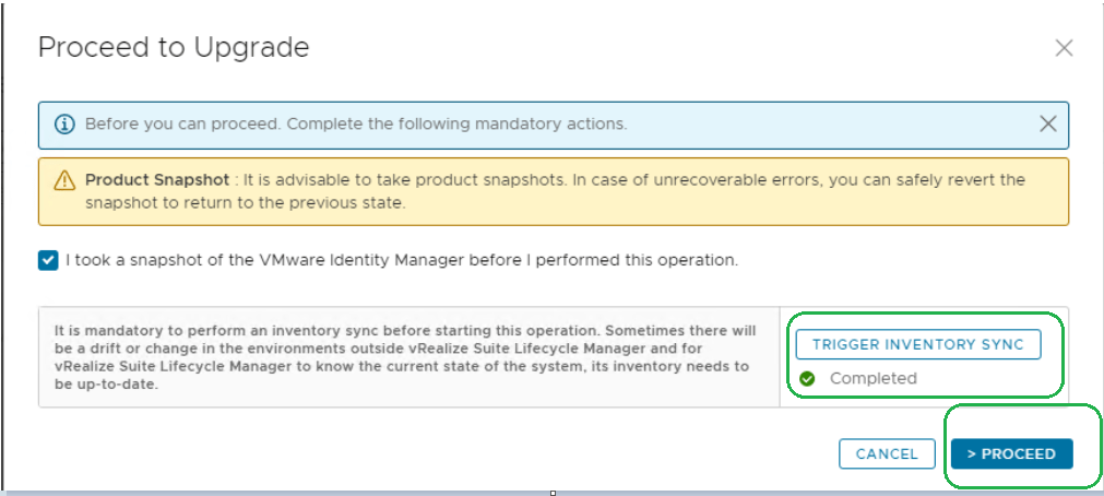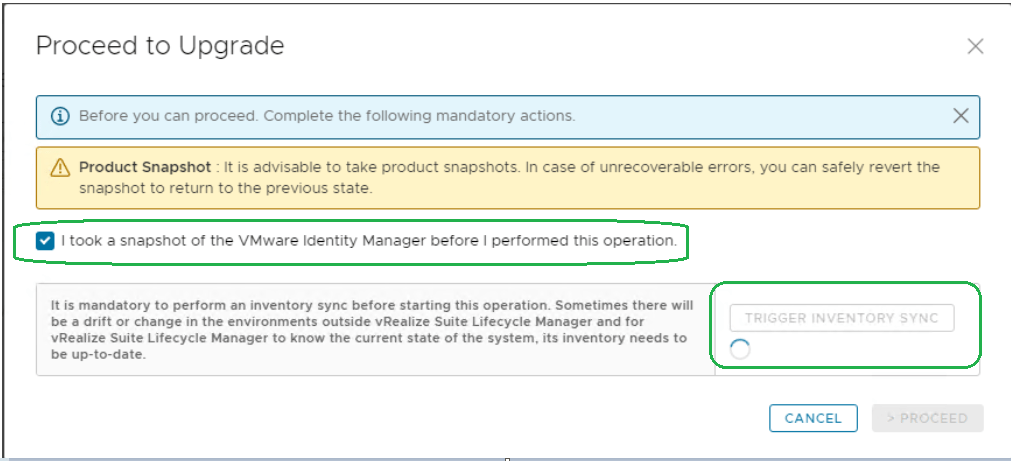 Once inventory sync is completed click on proceed and you will be prompt where it says Snapshot will be taken as part of VRA upgrade .