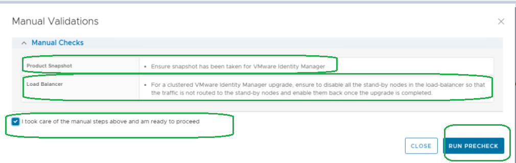 Once you click on Run Pre check you may see pop for confirmation of the snapshot and make sure you have disabled the Stand by nodes in Load balancer.