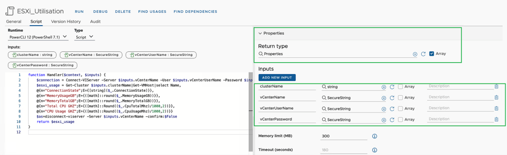 $esxi_usage = Get-Cluster $inputs.clusterName|Get-VMHost|select Name,