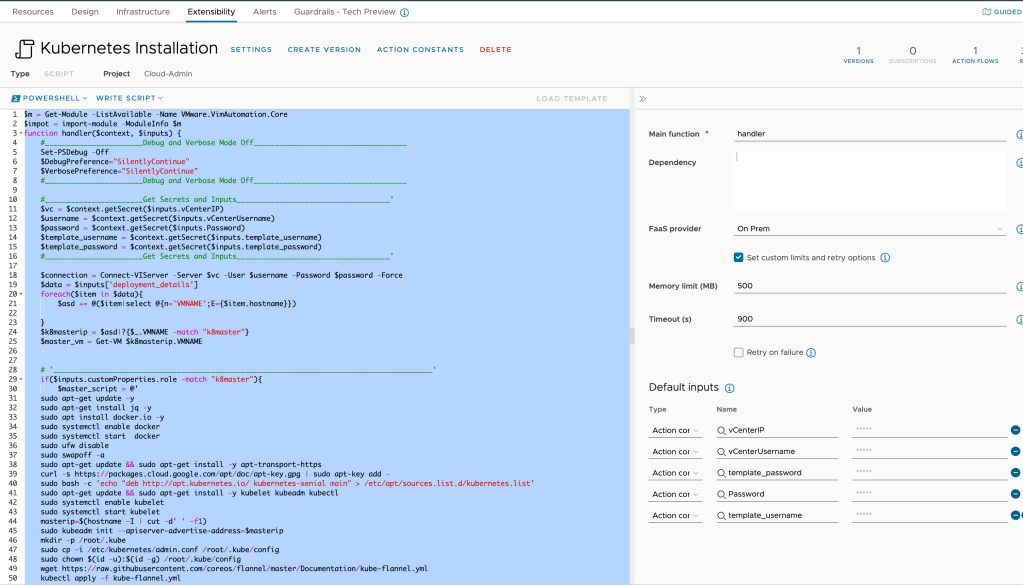 Next Step is to create the PowerCli abx action which will be doing the heavy lifting of installation of all packages and Adding the worker node to Master.